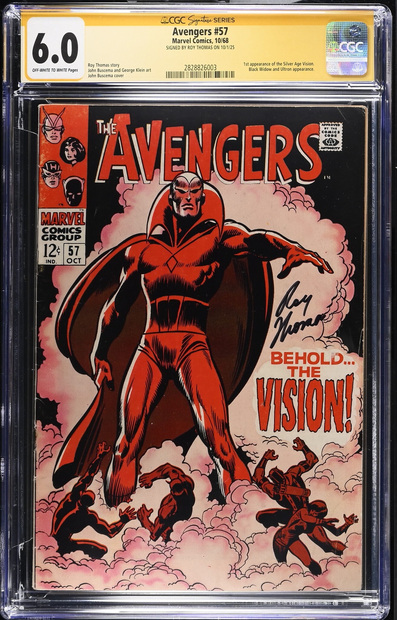 Important Silver Age Avengers key featuring the 1st ppearance of the Silver Age Vision, with appearances by Black Widow and Ultron. This copy is signed by writer Roy Thomas on 10/1/25, authenticated by CGC under the Signature Series label.