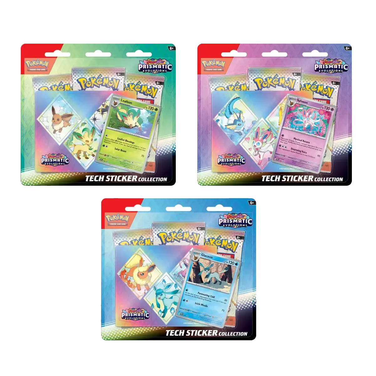 Cute yet majestic, Eevee’s three most recently discovered Evolutions should not be underestimated in battle! Join forces with Leafeon, Glaceon, or Sylveon as a foil promo card, then decorate your computer, tablet, or phone with durable tech stickers! You also get three booster packs from the special Scarlet & Violet—Prismatic Evolutions expansion, just waiting to be opened and added to your collection.